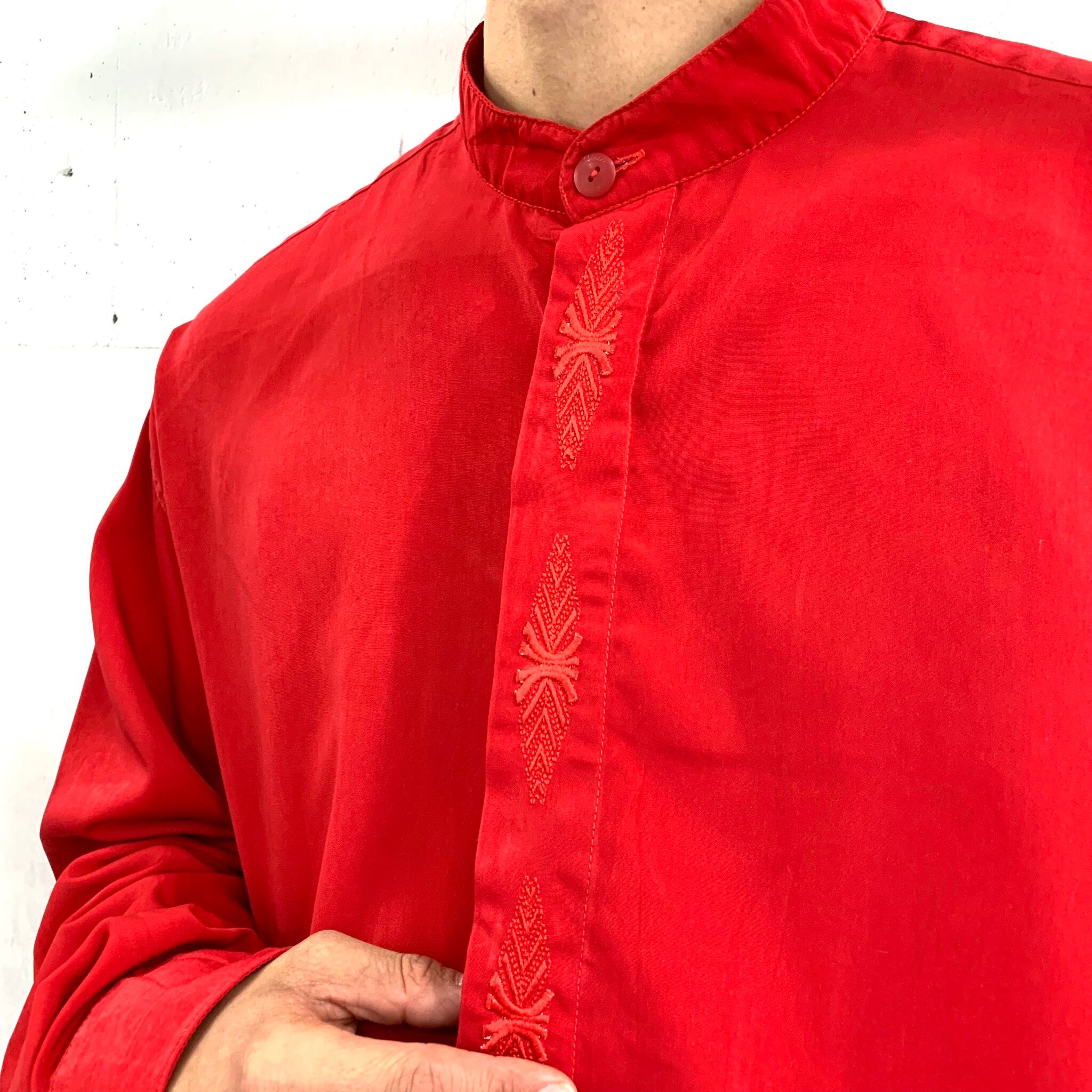 アメリカ古着 KOZOM スタンドカラーシャツ バンドカラーシャツ 刺繍シャツ 赤