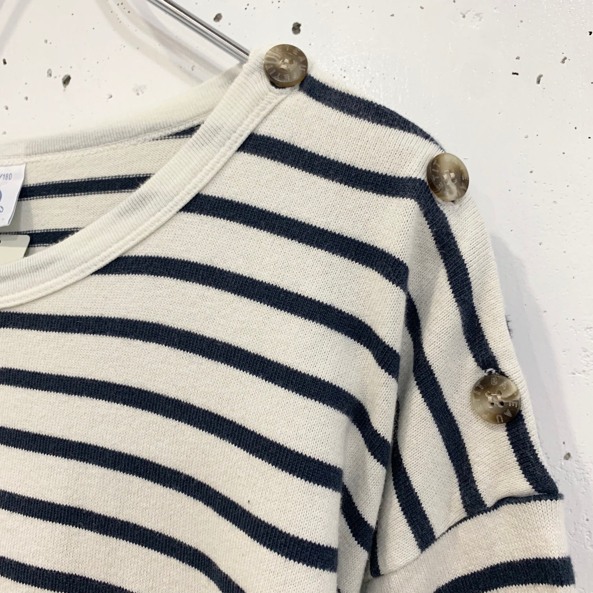肩ボタン、紺×白のボーダーが可愛らしいデザインで、